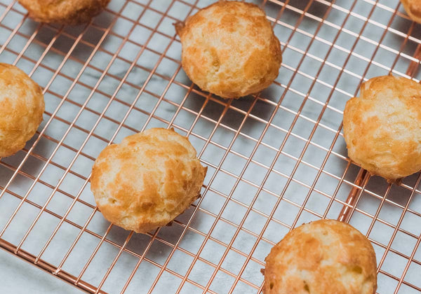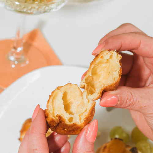 Voilà! Your Bougie Gougies are a beautiful golden brown and they’re ready to be served. Pull out your favorite tray and you’re ready to entertain. Bougie Gougies pair well with champagne, chocolate, and well, toutes les options! Bon appétit!